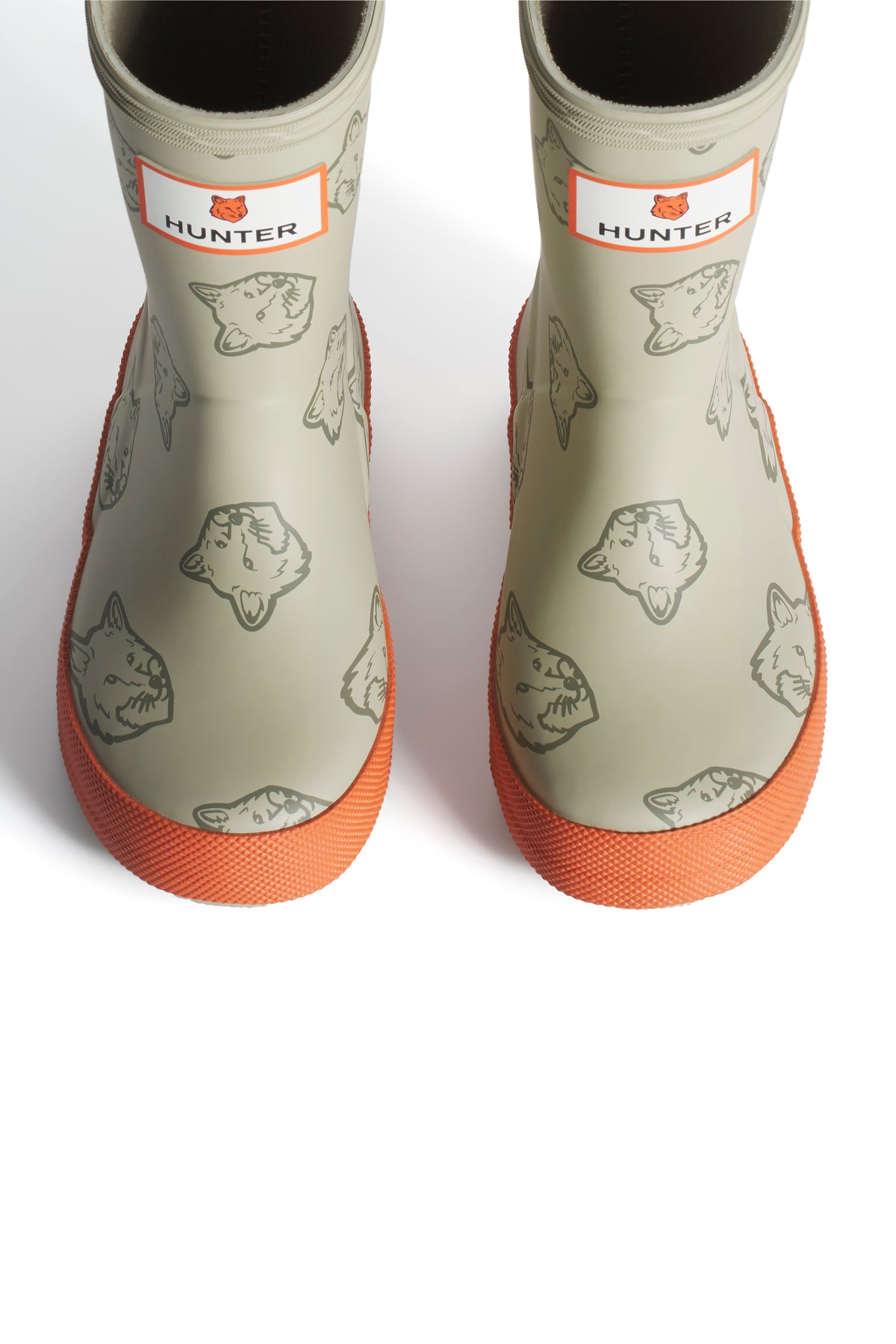 Waterproof rubber boots for kids with Fox Head print all-over. Maison Kitsuné x Hunter collaboration.