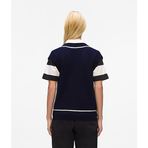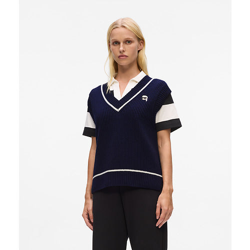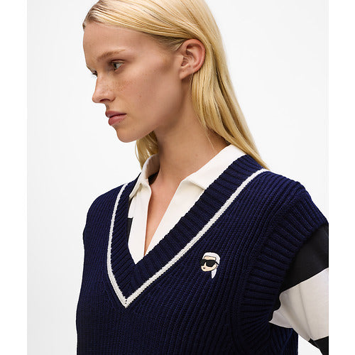 This merino wool vest features a classic sleeveless design with a V-neck for preppy sophistication. Contrasting white piping highlights its refined silhouette, while Ikon Karl artwork offers a bold finishing touch.