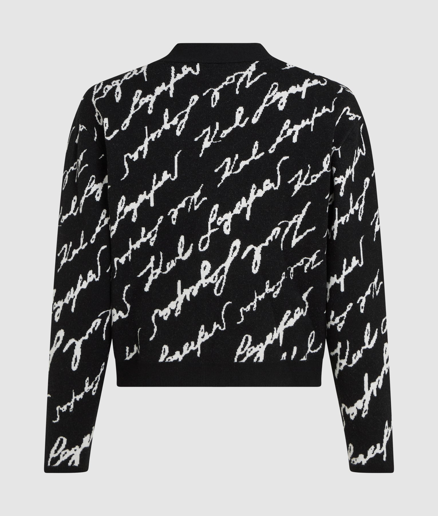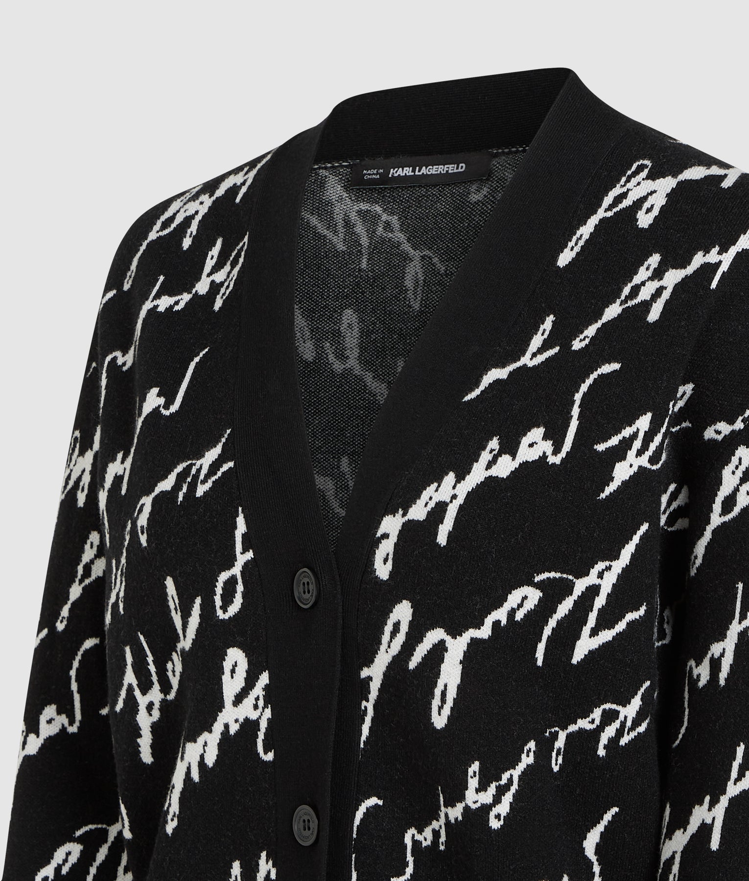 Elevate your layering pieces with the KARL LAGERFELD Jacquard Signature Cardigan. Crafted from soft jacquard knit, this cardigan features a subtle all-over KARL signature pattern, a classic button-down front, and a relaxed yet refined fit. Perfect for pairing with dresses, skirts, or trousers, it brings effortless designer style to everyday outfits.